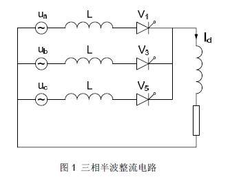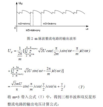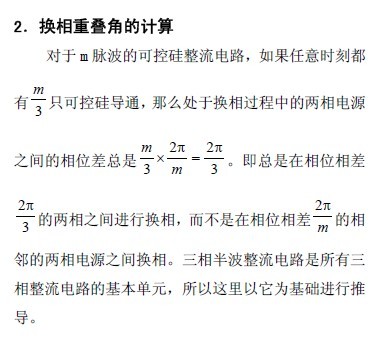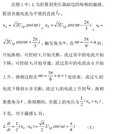 在帶有整流變壓器的可控硅整流電路中,整流變壓器的阻抗是一個很重要的參數(shù)。整流變壓器的阻抗導(dǎo)致了換相重疊的產(chǎn)生,使輸出電壓產(chǎn)生換相損失,而且使輸入功率因數(shù)降低。對整流器所產(chǎn)生的電流諧波含量也有一定的影響。由整流變壓器的阻抗而產(chǎn)生的換相重疊角對逆變電路的工作狀態(tài)有重要影響。因此,研究這些參數(shù)之間的定量關(guān)系是很必要的。參考文獻[1]、[2]、[3]中所列出的傳統(tǒng)電力電子學(xué)教材中,都對此有講述。但參考文獻[1]、[2]在計算公式的推導(dǎo)過程中有不妥之處,將電源的相數(shù)m 與整流電路輸出脈波數(shù)m 等同起來。且這些參考文獻中均未給出阻抗與整流器的功率因數(shù)之間的關(guān)系式。因此,作為補充,詳細推導(dǎo)這些參數(shù)間的關(guān)系是必要的。