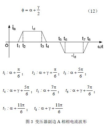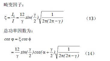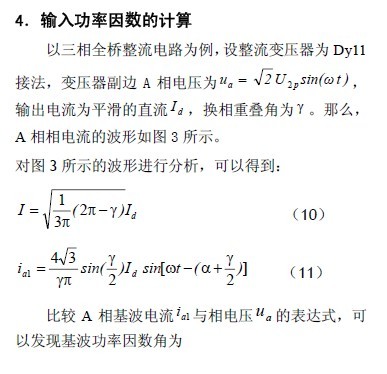 雖然公式(12)、(13)、(14)是從變壓器副邊的電流波形推導(dǎo)出來的,但如果不考慮變壓器的空載電流,變壓器本身并不會改變整流器的功率因數(shù)。所以,從變壓器的原邊來看,這三個公式依然正確。
