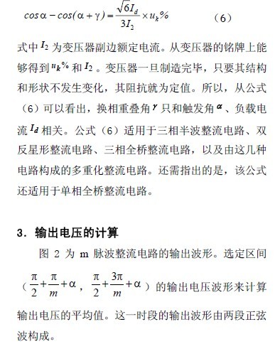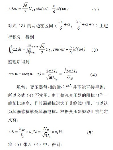 通過詳細的理論分析,推導(dǎo)出了整流變壓器的阻抗與換相重疊角、輸出電壓、輸入功率因數(shù)的關(guān)系。這些公式具有普適性。較之公式(4),公式(6)具有更大的實用價值。這些公式對三相整流電路的設(shè)計具有較強的指導(dǎo)意義。